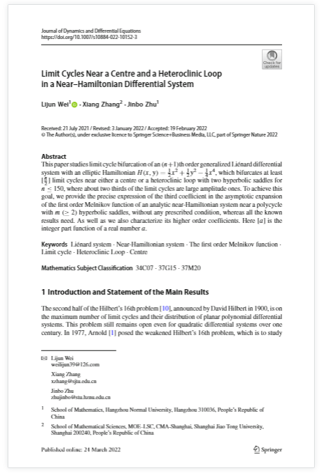 近日,在线之家 数学与应用数学(师范)183班朱锦波同学在指导教师卫丽君老师的指导下,并与上海交通大学张祥教授合作在常微分方程与动力系统方向高水平国际期刊Journal of Dynamics and Differential Equations(JCR:Q1)上发表题为“Limit Cycles Near a Centre and a Heteroclinic Loop in a Near–Hamiltonian Differential System”的学术论文。