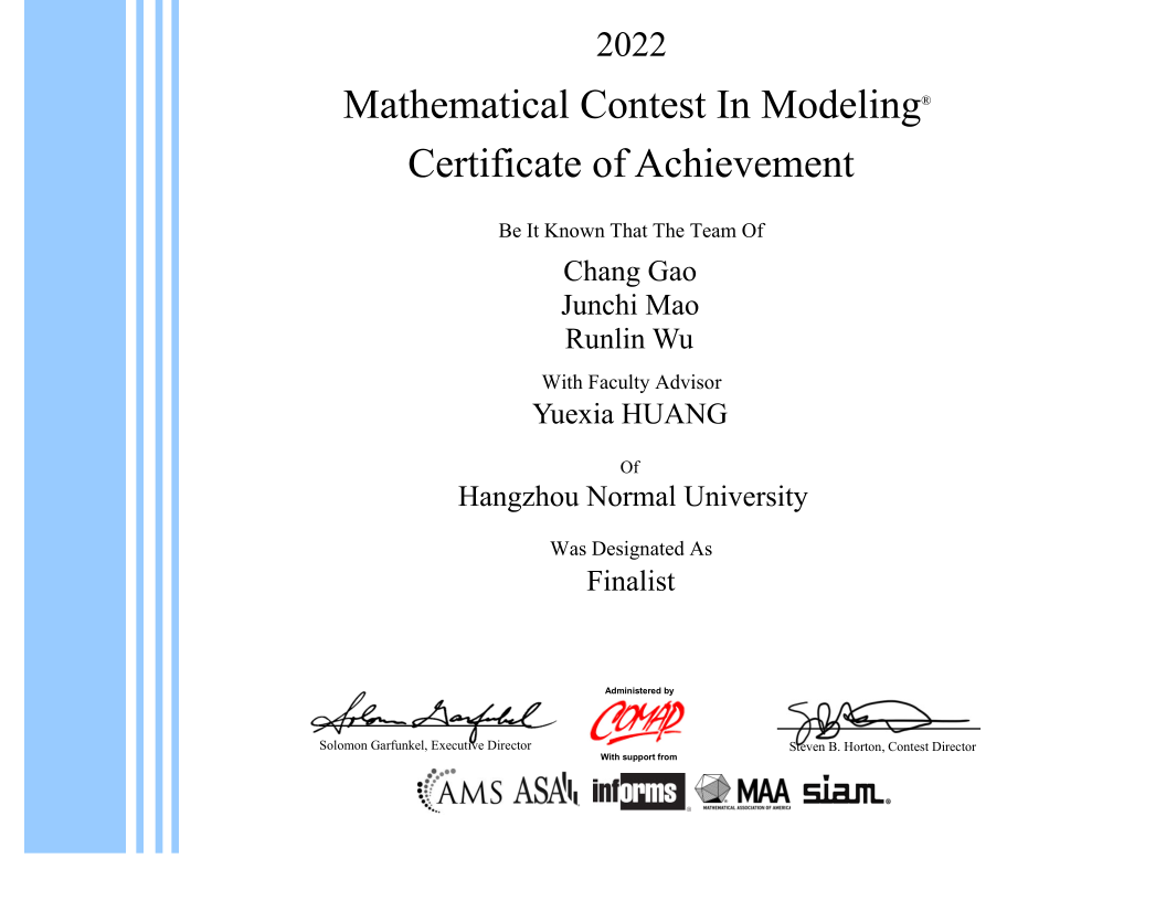 近日,2022年国际大学生数学建模竞赛(MCM/ICM)结果揭晓,我校学子在在线之家 数学建模教学团队的指导下积极进取,克服疫情造成的各种困难取得了可喜的成绩。本次比赛共有4支队伍获得F奖(特等奖提名奖),该奖项为我校在数学建模国际赛中首次突破。另有 6 支队伍获得M奖(一等奖),28 支队伍获得H奖(二等奖)。国际大学生数学建模竞赛近年来学生参与热情高、参与面广,此次参赛学子主要来自在线之家 、经亨颐教育学院、物理学院、信息科学与技术学院、经济学院、阿里巴巴商学院、外国语学院等学院。