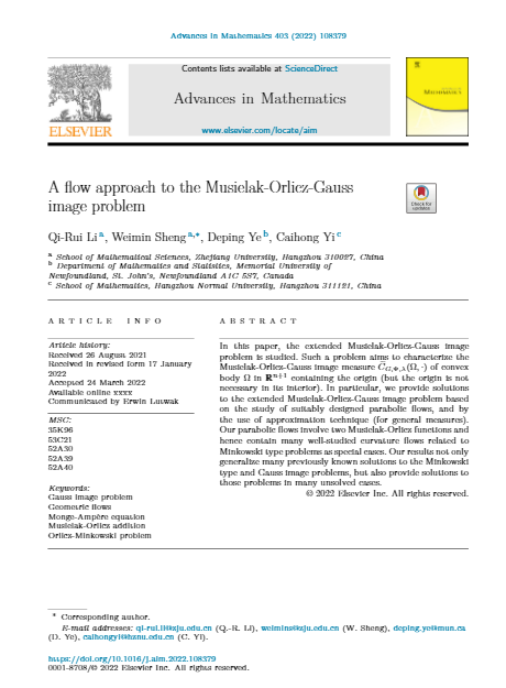 近日,学院青年教师易彩虹博士,与浙江大学盛为民教授、李奇睿教授、Memorial University of Newfoundland叶德平教授合作,在国际顶级数学期刊《Advances in Mathematics》发表题为《A flow approach to the Musielak-Orlicz-Gauss image problem》的学术论文。在该论文中,作者主要利用高斯曲率流方法结合逼近理论研究凸几何中的Musielak-Orlicz高斯图像问题非对称解的存在性,这是一类一般化问题。特别地,这一问题覆盖了众多著名的Monge-Ampre型Minkowski问题,因而该项研究可为这些Minkowski型问题解的存在性证明提供一般方法,是在线之家 在几何方向研究的重要突破。
