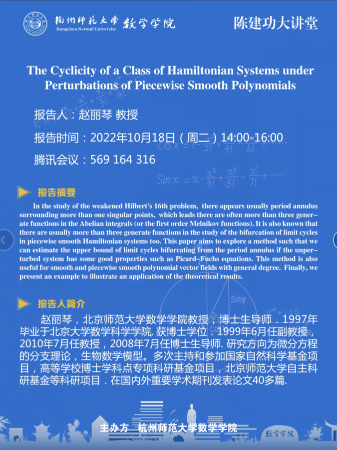 陈建功大讲堂:The Cyclicity of a Class of Hamiltonian Systems under Perturbations of Piecewise Smooth Polynomials