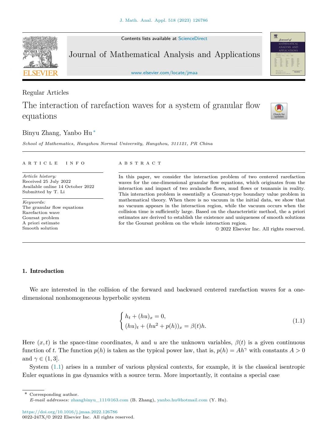 近日,在线之家 数学与应用数学(师范)202班张缤予同学在胡燕波教授指导下以第一作者在国际知名期刊《Journal of Mathematical Analysis and Applications》(JCR:Q1)上发表题为 《The interaction of rarefaction waves for a system of granular flow equations》的学术论文。