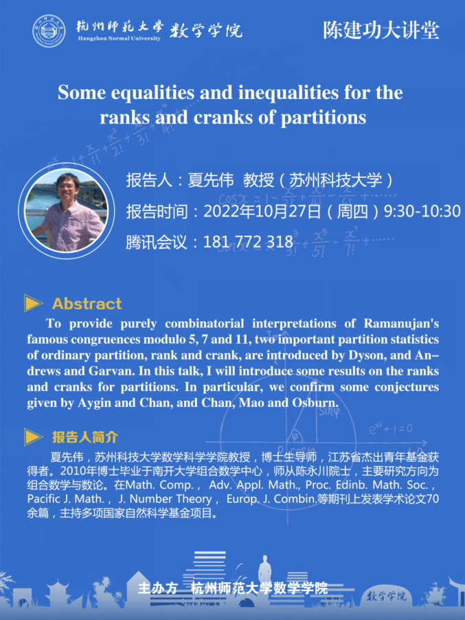 陈建功大讲堂:Some equalities and inequalities for the ranks and cranks of partitions