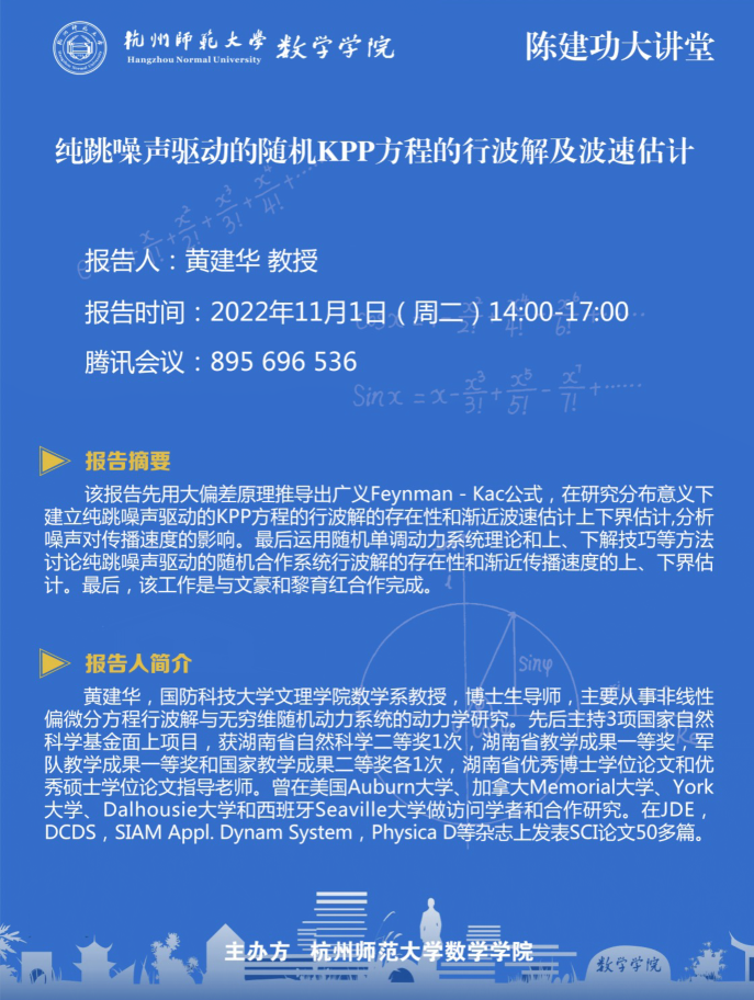 陈建功大讲堂:纯跳噪声驱动的随机KPP方程的行波解及波速估计