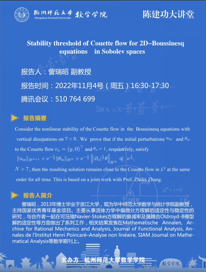 陈建功大讲堂:Stability threshold of Couette flow for 2D-Boussinesq equations in Sobolev spaces