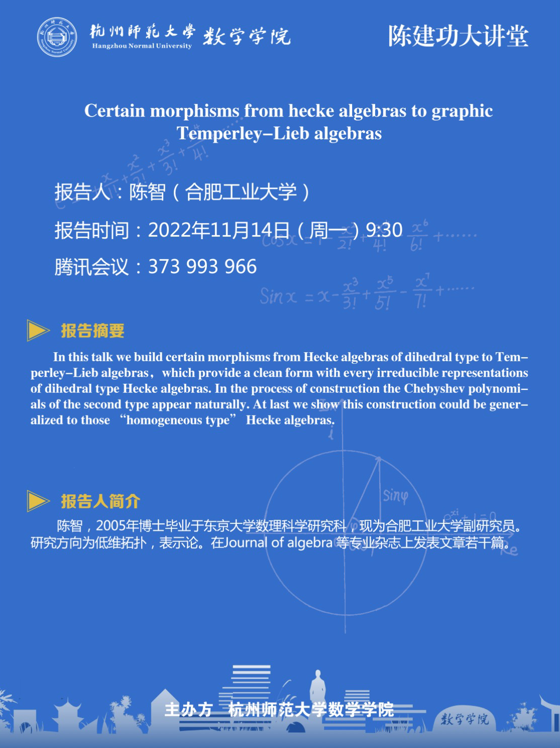 陈建功大讲堂:Certain morphisms from hecke algebras to graphic Temperley-Lieb algebras