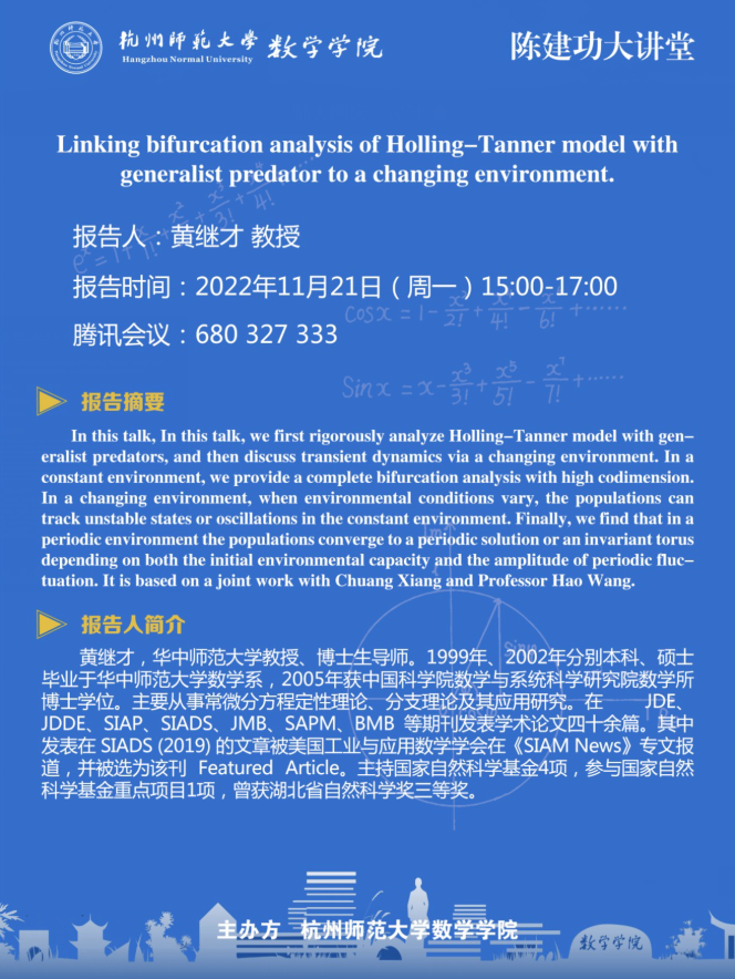 陈建功大讲堂:Linking bifurcation analysis of Holling-Tanner model with generalist predator to a changing environment