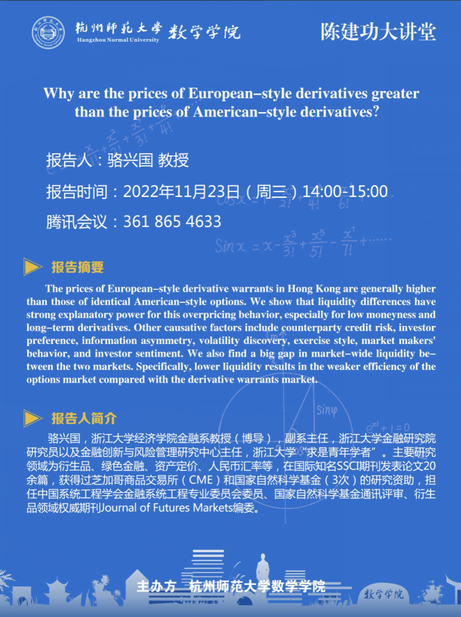 陈建功大讲堂:Why are the prices of European-style derivatives greater than the prices of American-style derivatives