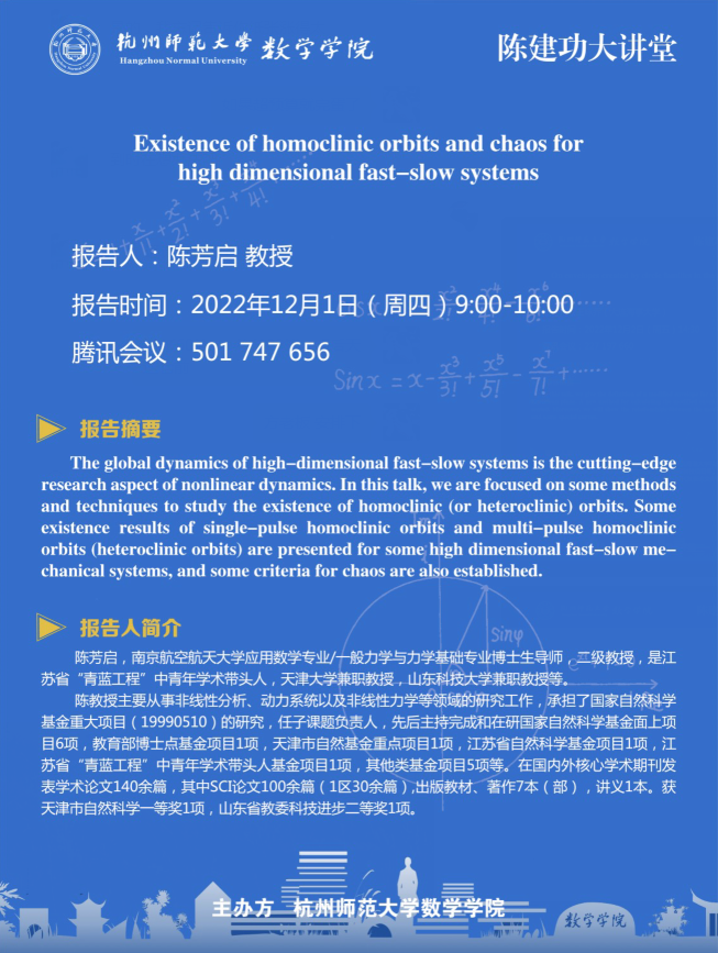 陈建功大讲堂:Existence of homoclinic orbits and chaos for high dimensional fast-slow systems