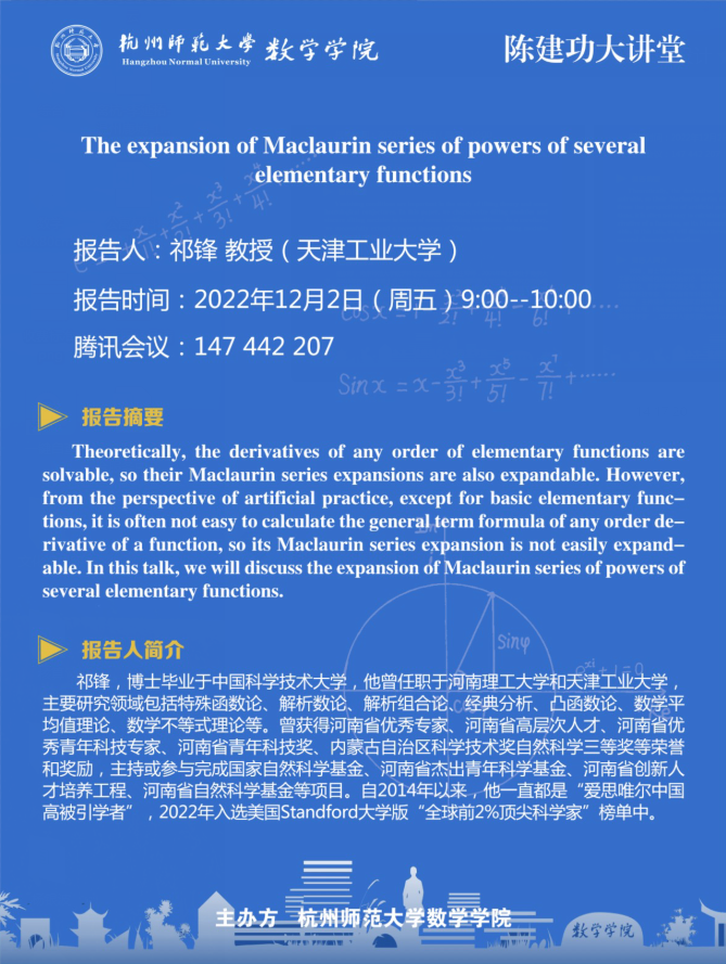 陈建功大讲堂:The expansion of Maclaurin series of powers of several elementary functions