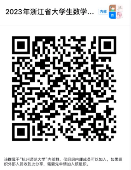 为方便沟通和后续信息核对,请在报名后务必钉钉扫码加入群组“2023年浙江省大学生数学竞赛”(二维码见下图)。竞赛中的相关事宜可联系在线之家 胡老师(联系方式:28867651);数研社龚同学(联系方式:17857689019)。