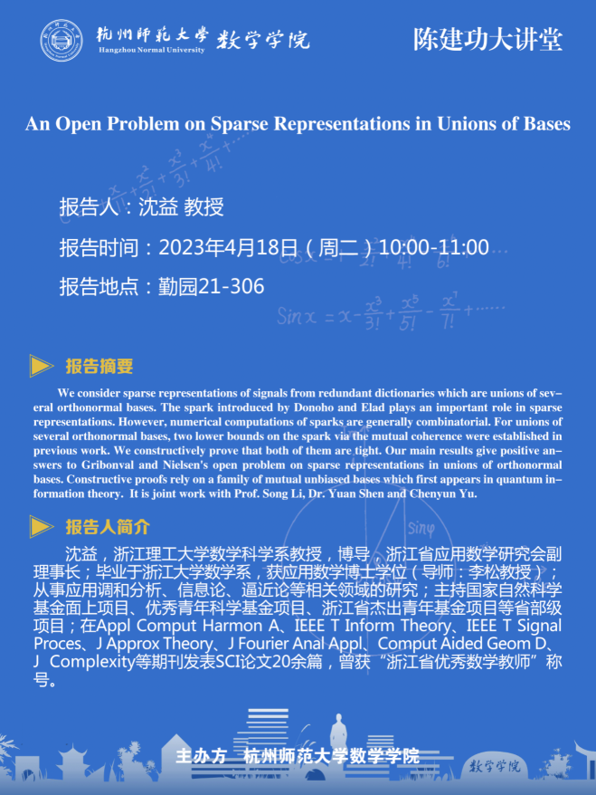 陈建功大讲堂:An Open Problem on Sparse Representations in Unions of Bases