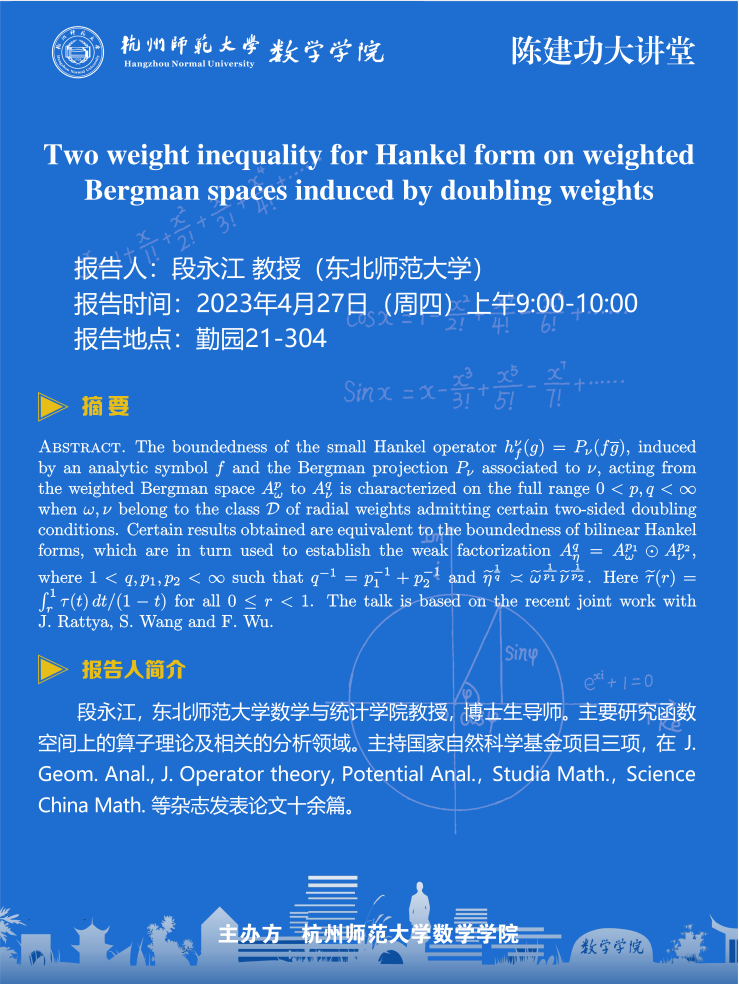 陈建功大讲堂:Two weight inequality for Hankel form on weighted Bergman spaces induced by doubling weights