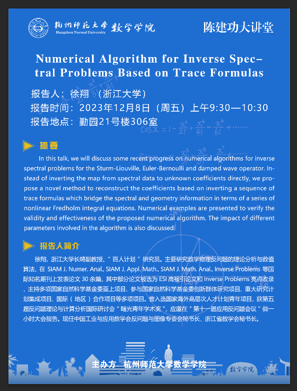 陈建功大讲堂:Numerical Algorithm for Inverse Spectral Problems Based on Trace Formulas