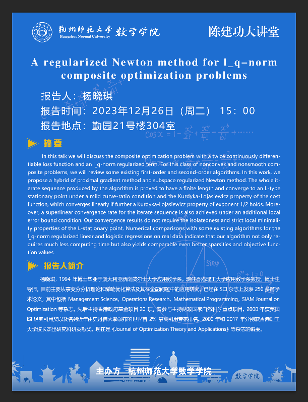 陈建功大讲堂:A regularized Newton method for l_q-norm composite optimization problems