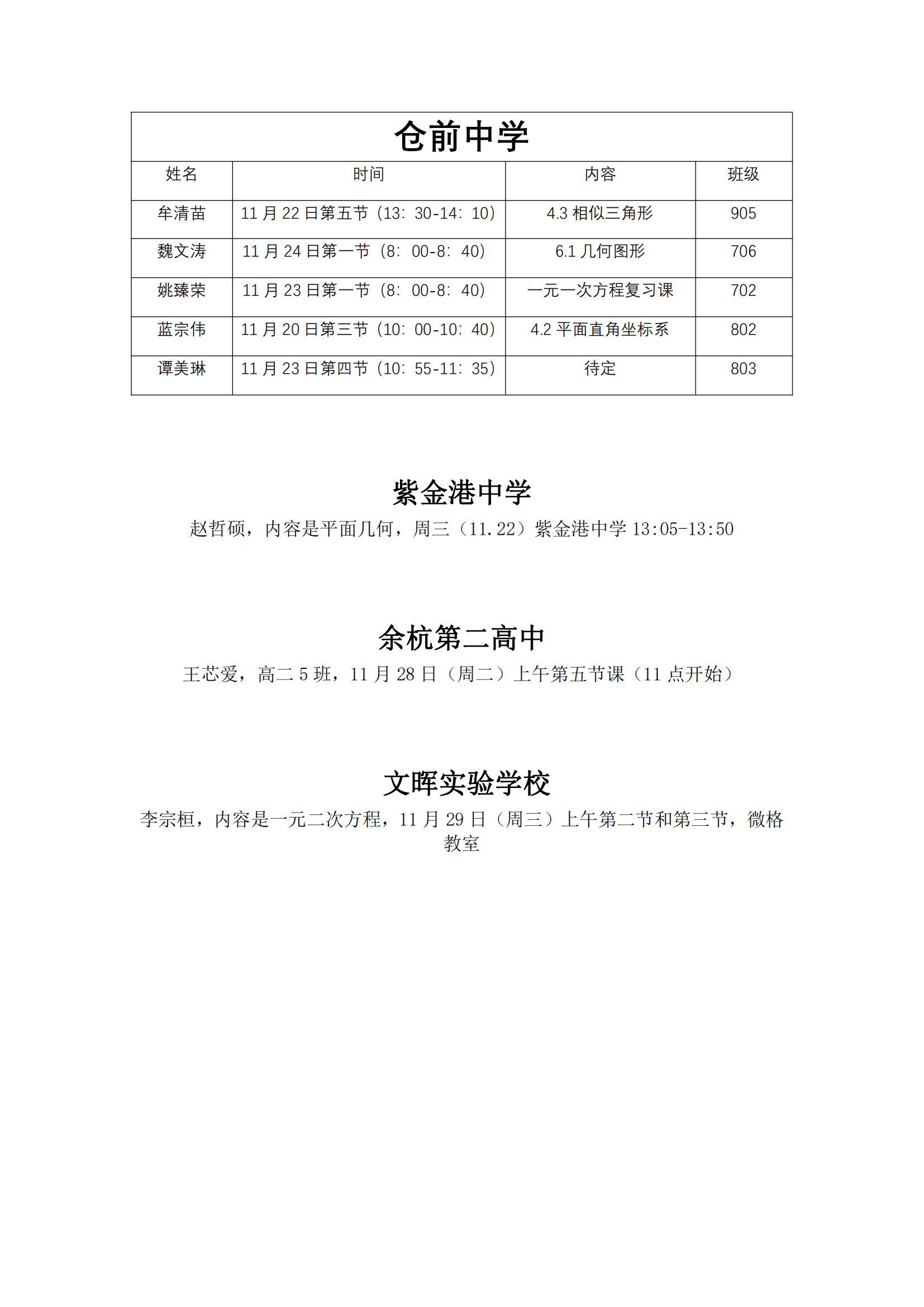 在线之家 2023-2024学年第一学期仓前中学等4个点实习生公开课安排