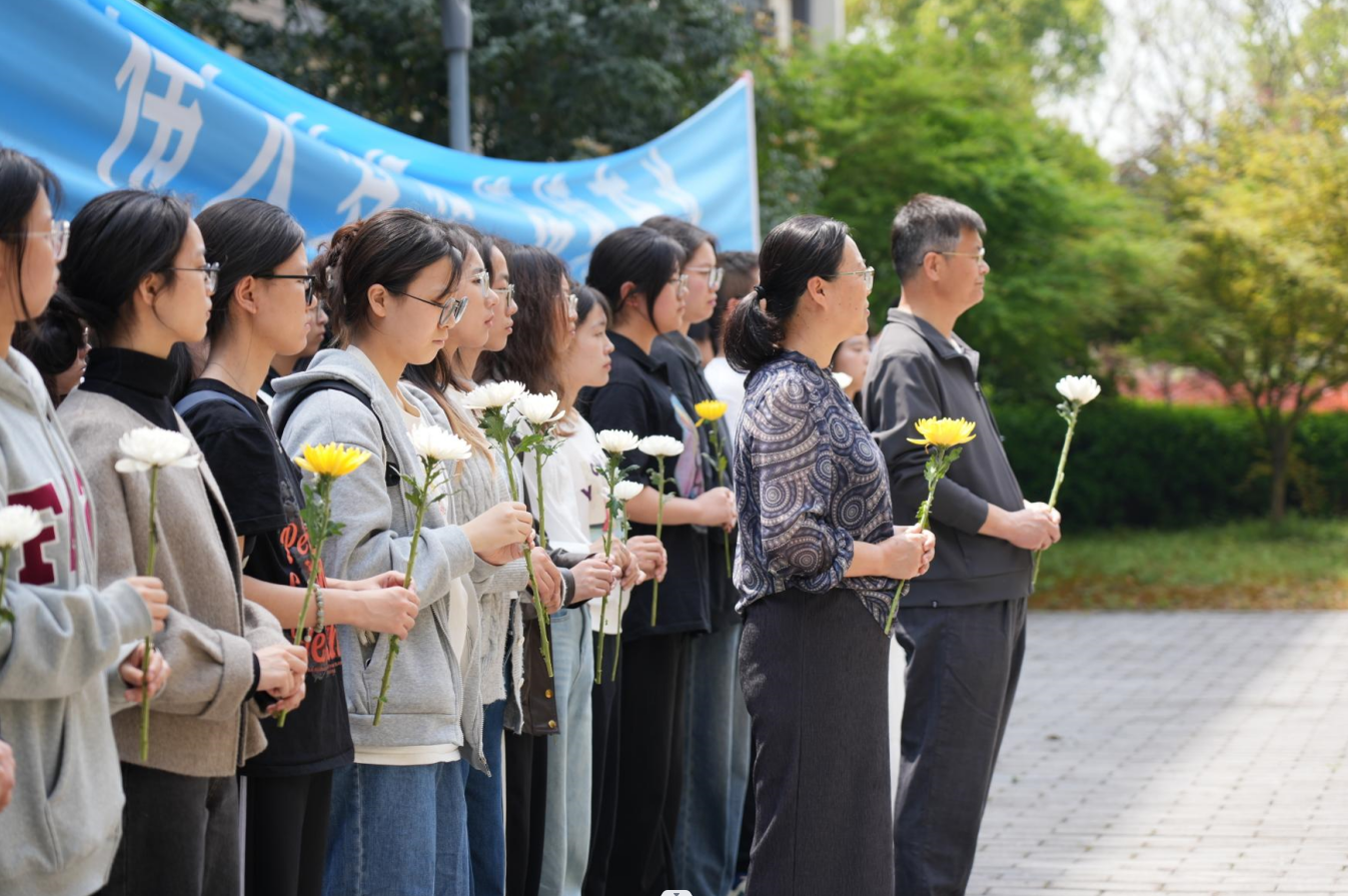 最后是集体向陈建功先生表达缅怀、献花的环节,师生排成一列整齐有序的来到陈建功像前将菊花枝轻轻的放下。当我们在像前默哀,当我们在像前鞠躬,深刻地被陈建功先生“知行合一,为国育才”的精神所感动。愿建功精神长存!