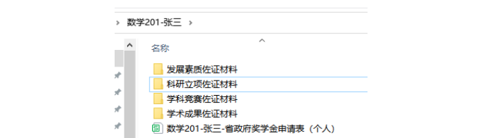 3.申请的同学请填写 附件3 在线之家 省政府奖学金申请表(个人) ,与相关佐证材料整理打包,文件夹命名为“班级-姓名”,佐证材料汇总方式如图所示: