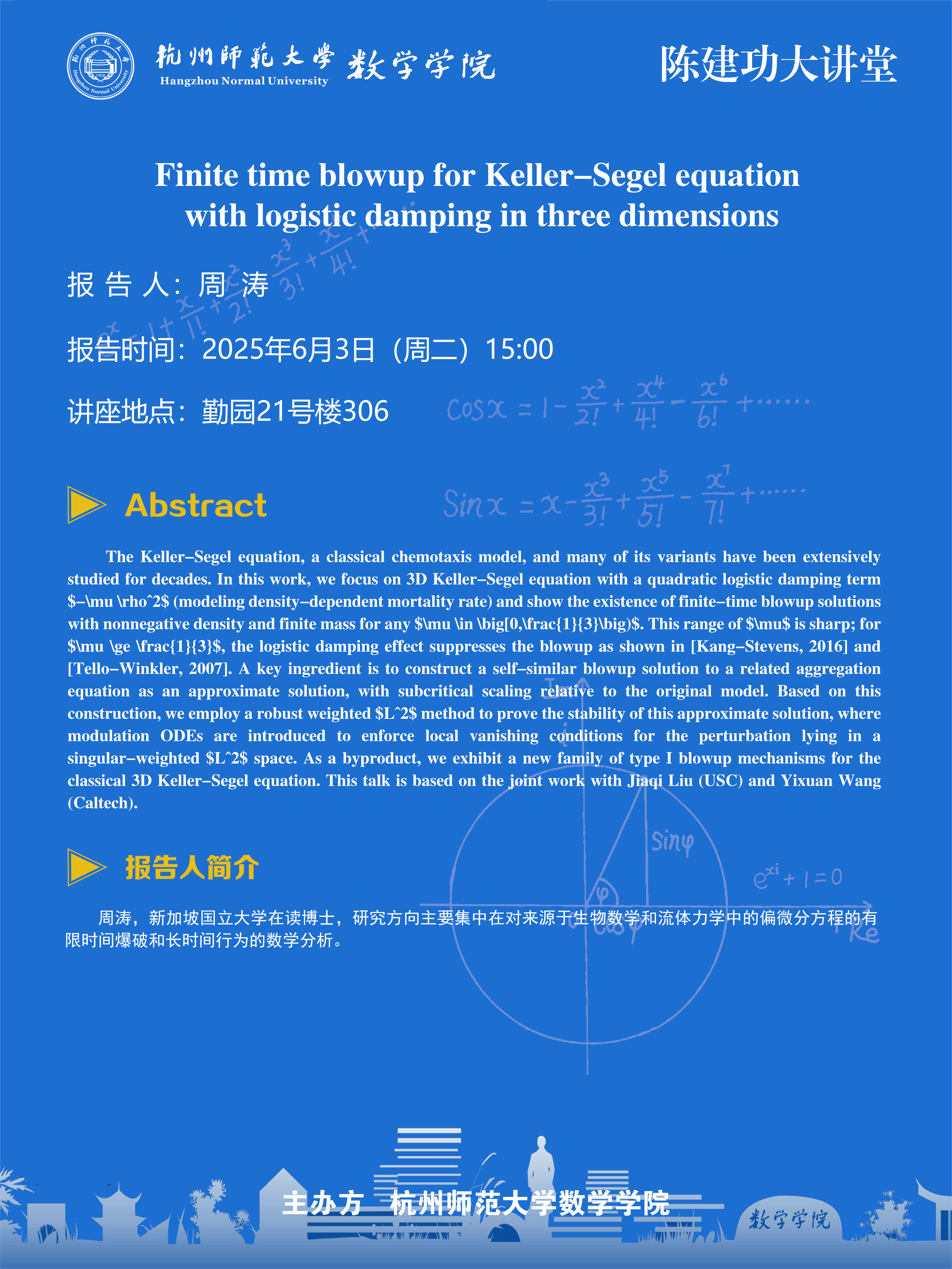 陈建功大讲堂(2025-46):Finite time blowup for Keller-Segel equation with logistic damping in three dimensions