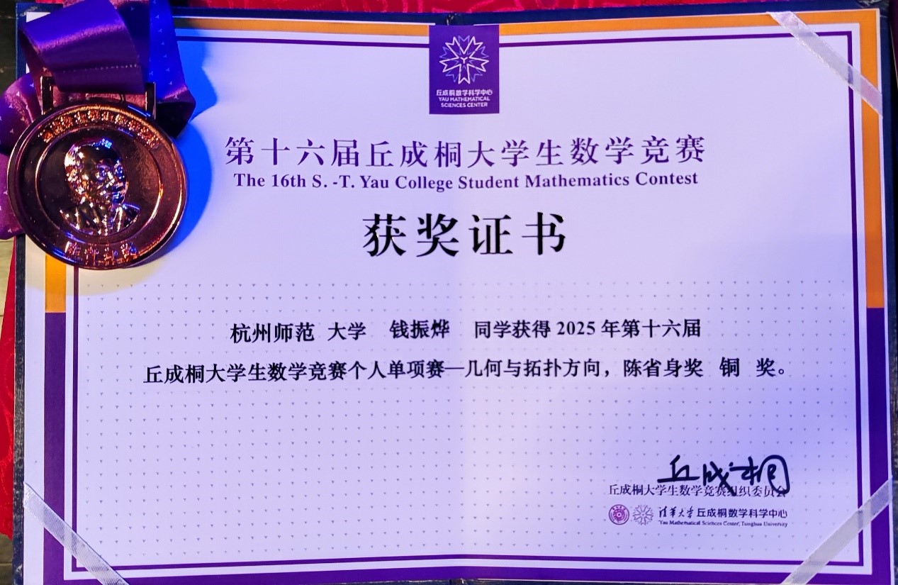 第十六届丘成桐大学生数学竞赛总决赛于6月28日在北京举行,大赛共决出68个奖项(个人单项59项,个人全能奖3项,团体奖6项),其中清华大学获30个奖项,北京大学获23个奖项,中国科学技术大学获5个奖项,浙江大学获2个单项奖,中国科学院大学、南京大学、南开大学、同济大学、中山大学、华东师范大学、在线之家 、莫斯科物理技术学院各获1个单项奖。在线之家 2022级建功班学生钱振烨以“几何与拓扑”单项优异成绩入围决赛,最终获得了第十六届丘成桐大学生数学竞赛陈省身奖(几何与拓扑方向)铜奖,是唯一一位来自非“双一流”大学的选手,这也是我校学子首次获得该项“高难度”大学生数学竞赛的奖牌。另外,钱振烨、李福汉、王嘉海、郑朝城、胡芷境、吴一昊等六位同学获得团体优胜奖,是唯一一个非985高校获得优胜奖的团队。