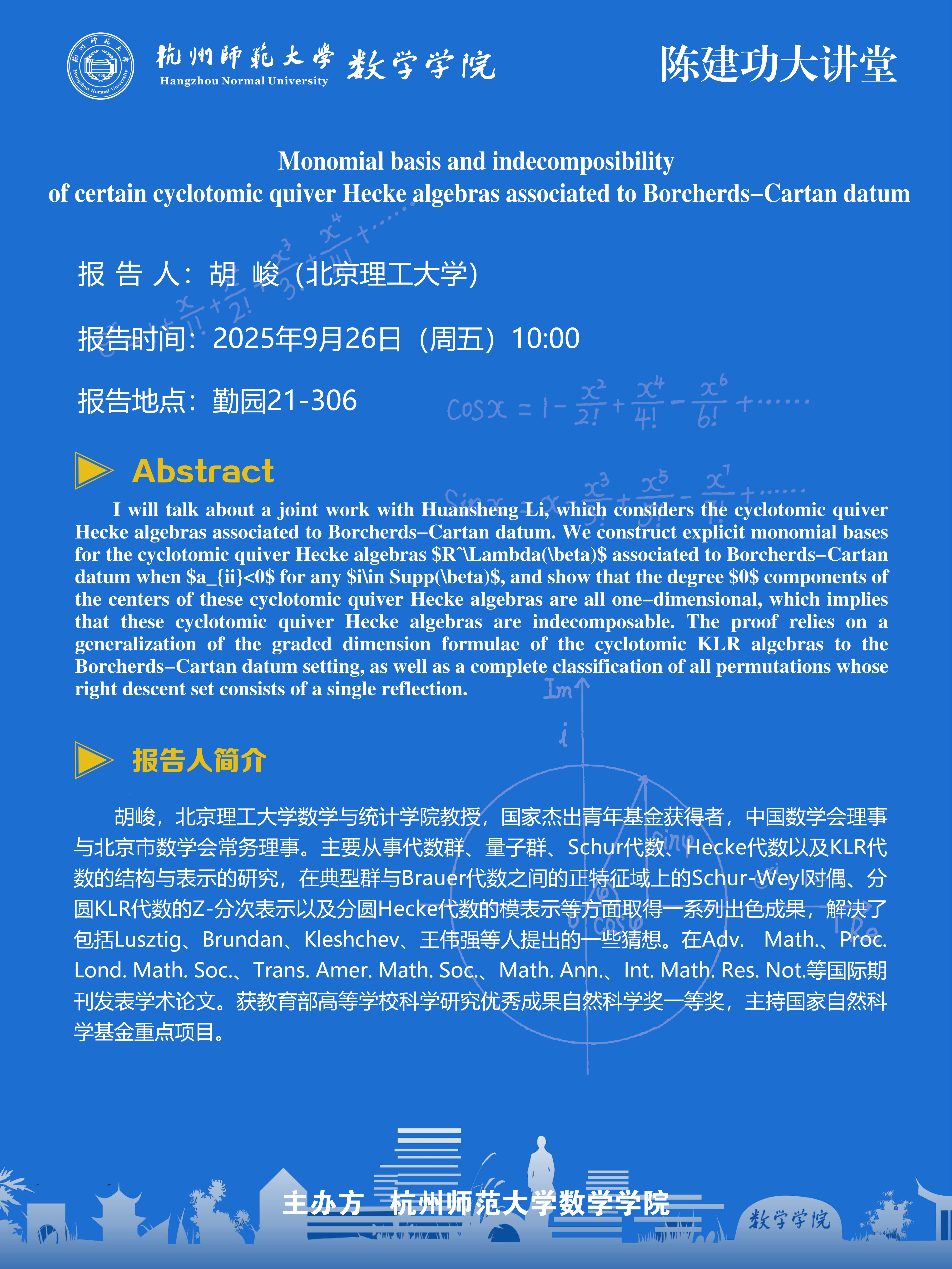 陈建功大讲堂(2025-75): Monomial basis and indecomposibility of certain cyclotomic quiver Hecke algebras associated to Borcherds-Cartan datum