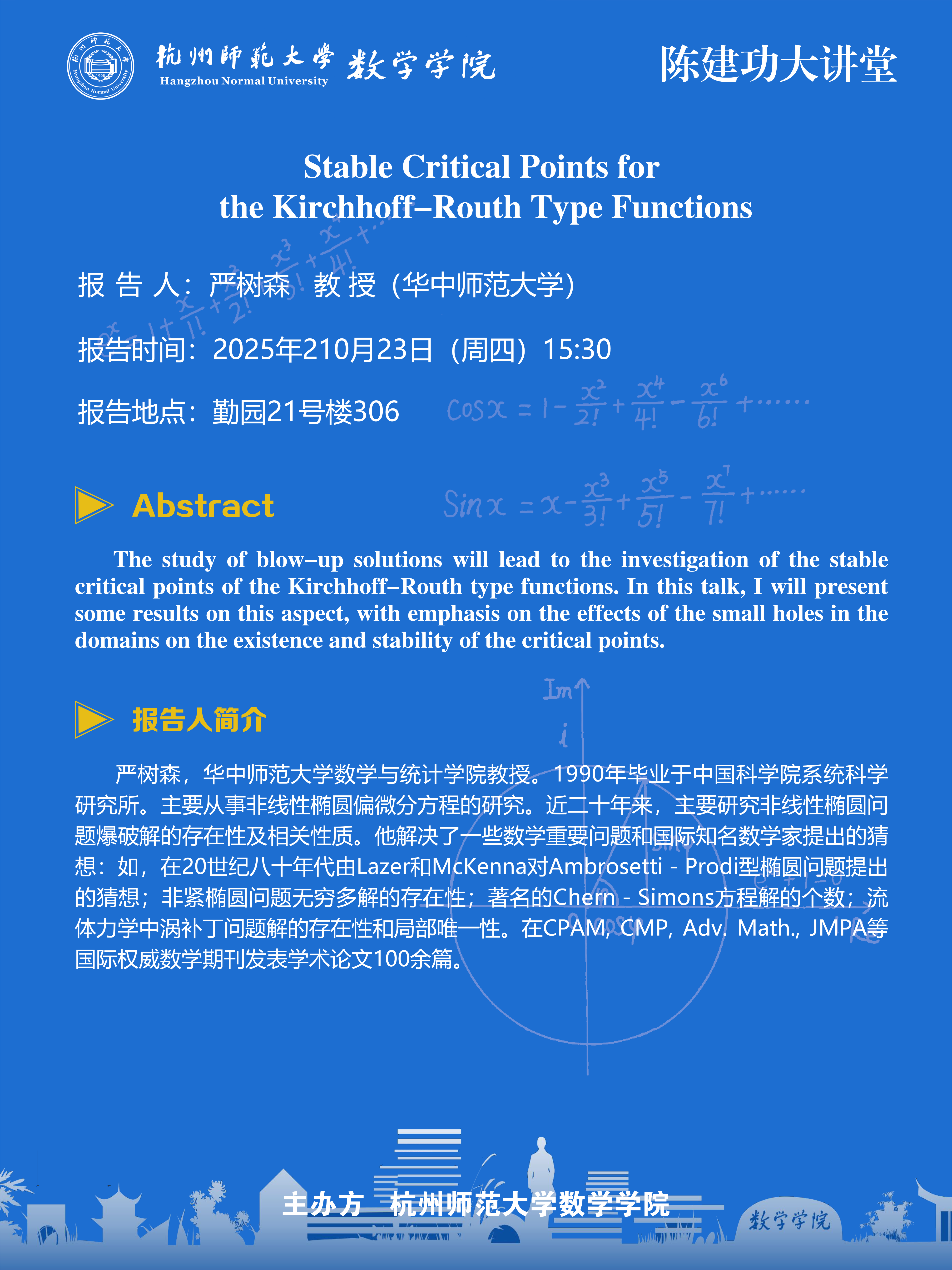 陈建功大讲堂(2025-95):Stable Critical Points for the Kirchhoff-Routh Type Functions