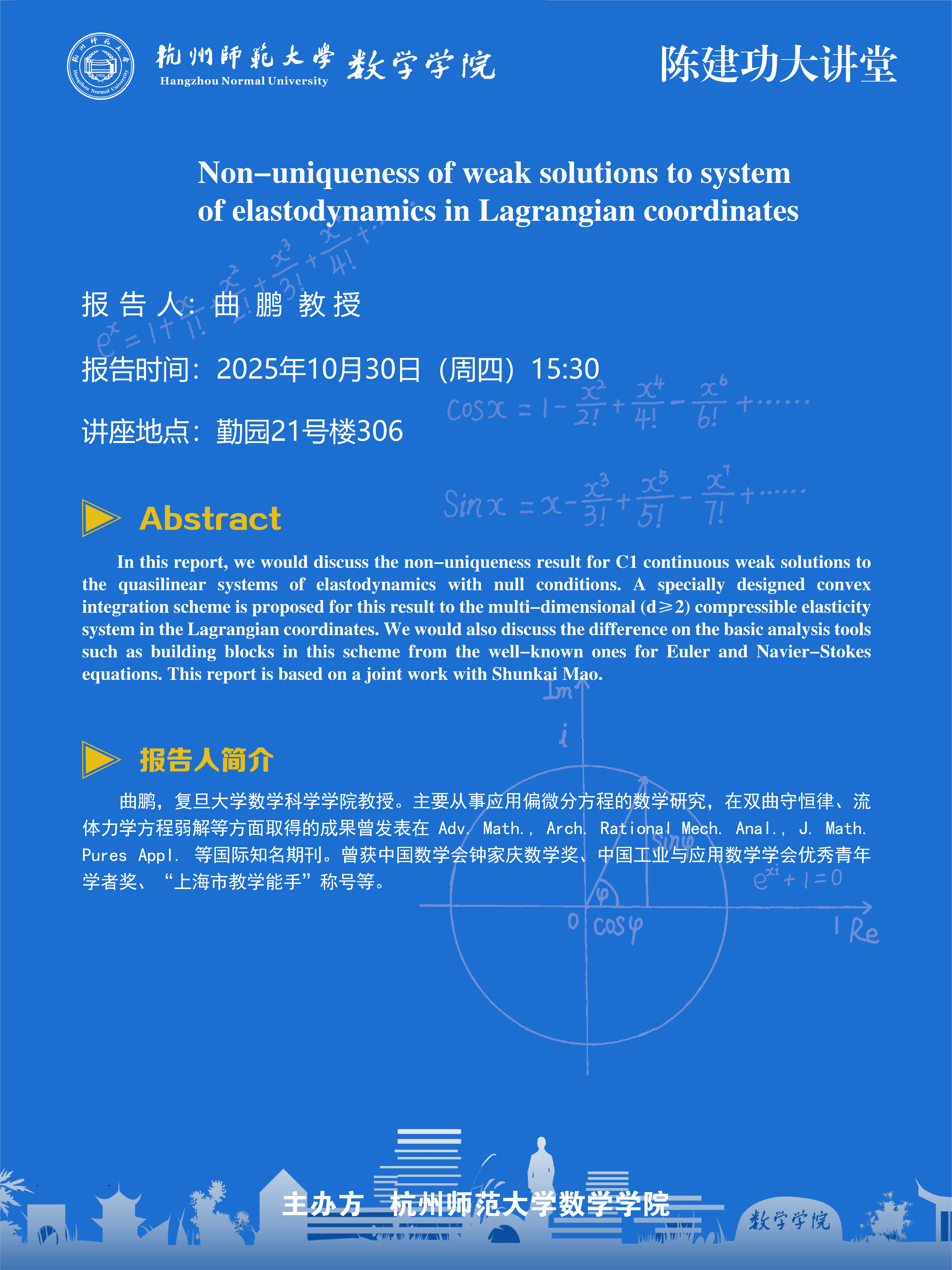 陈建功大讲堂(2025-108):Non-uniqueness of weak solutions to system of elastodynamics in Lagrangian coordinates