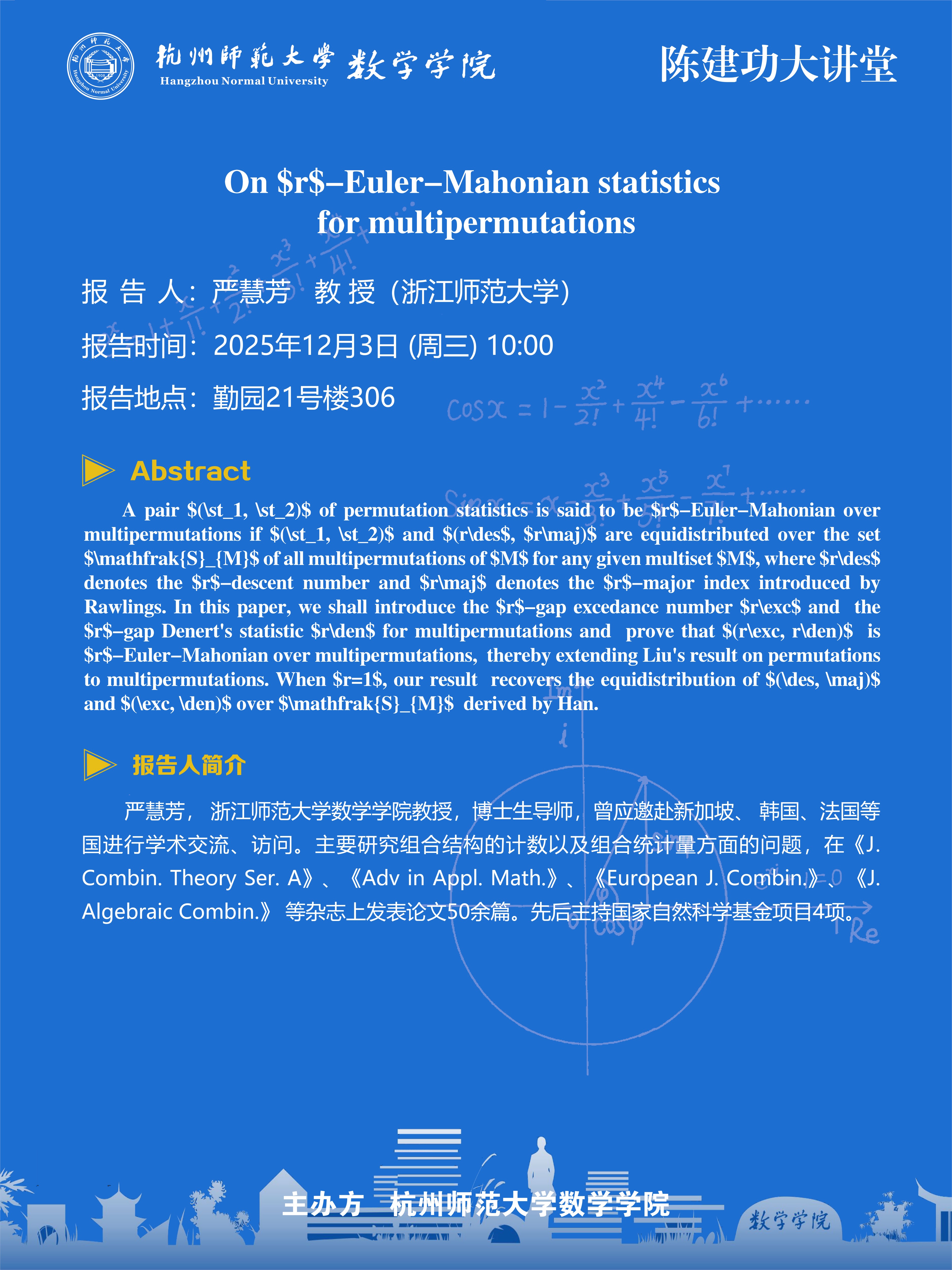 陈建功大讲堂(2025-146):On $r$-Euler-Mahonian statistics for multipermutations