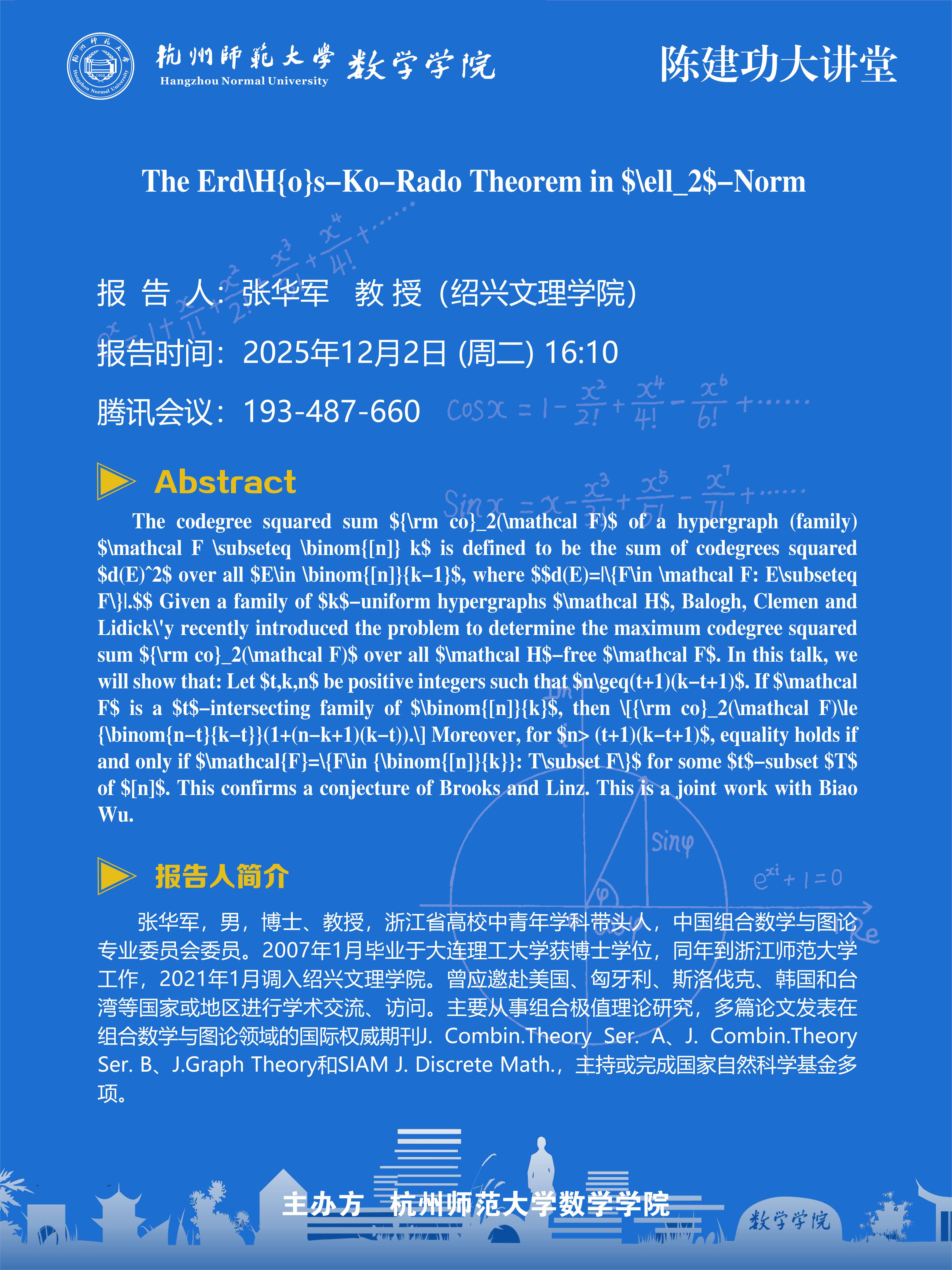 陈建功大讲堂(2025-150):The Erd\H{o}s-Ko-Rado Theorem in $\ell_2$-Norm