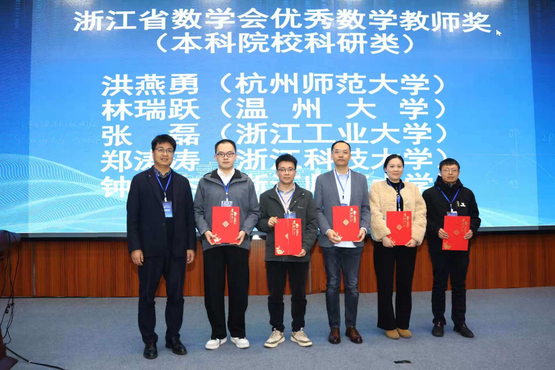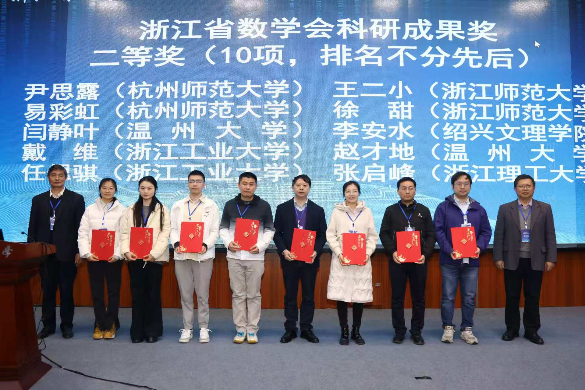 随后,大会举行了浙江省数学会科研成果奖和优秀数学教师奖颁奖仪式。数学会副理事长、浙江大学盛为民教授宣读浙江省数学会优秀数学教师奖名单,数学会副理事长、浙江师范大学院长杨敏波教授为获奖者颁奖。数学会副理事长、宁波大学屈长征教授宣读浙江省数学会科研成果奖名单,数学会副理事长盛为民教授、杭师大在线之家 院长谢琪教授为获得浙江省数学会科研成果二等奖的颁奖,数学会理事长包刚院士、杭师大应悦纪委书记为获得浙江省数学会科研成果一等奖的颁奖。在线之家 洪燕勇教授获得优秀教师奖,苏一鸣教授获得科研成果一等奖,尹思露、易彩红获得科研成果二等奖。奖仪式由浙江省数学会秘书长、浙江大学徐翔教授主持。