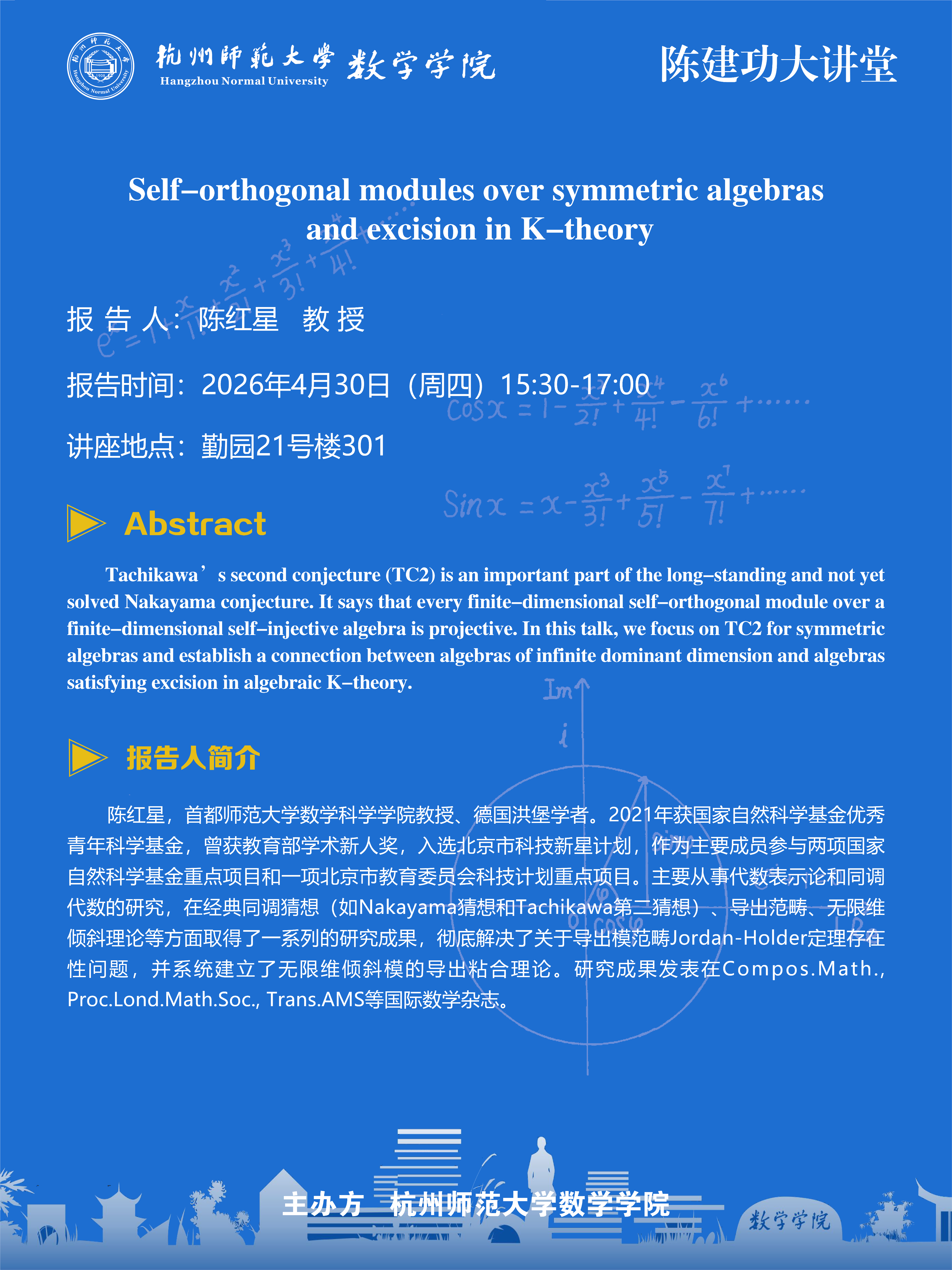 陈建功大讲堂(2026-23):Self-orthogonal modules over symmetric algebras and excision in K-theory